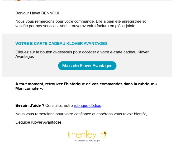 S'il s'agit d'une commande par le CSE, alors un mail sera envoyé au bénéficiaire depuis GEST CE > SKA avec un lien de redirection soit sur le site du CSE soit sur la rubrique "Ma carte cadeau visa".