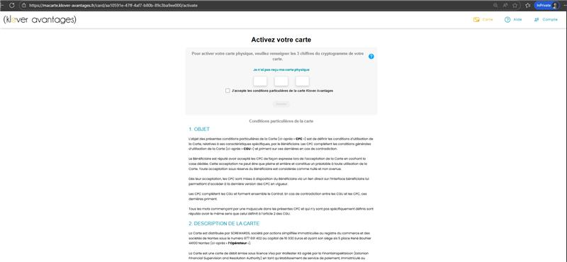 Il lui faudra indiquer son numéro de téléphone si la commande provient du CSE ou il sera directement redirigé sur son espace de carte visa si c'est une commande de Klover avantages.